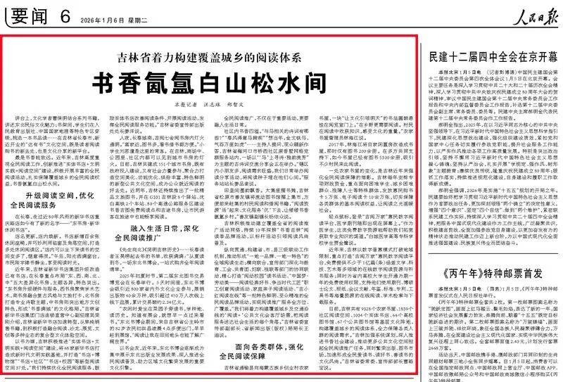 人民日报推出《吉林省着力构建覆盖城乡的阅读体系 书香氤氲白山松水间》、光明日报推出《书香氤氲白山松水间——吉林以“书店+”重构阅读场景激活文化活力》,报道近年来,吉林创新推进“实体书店+文明实践+阅读空间”建设,积极开展丰富的全民阅读活动。目前吉林共有9328个农家书屋、1839个社区阅读空间、1034个实体书店、66个高校图书馆、67个公共图书馆等基层文化阵地,构建起覆盖城乡的阅读体系。