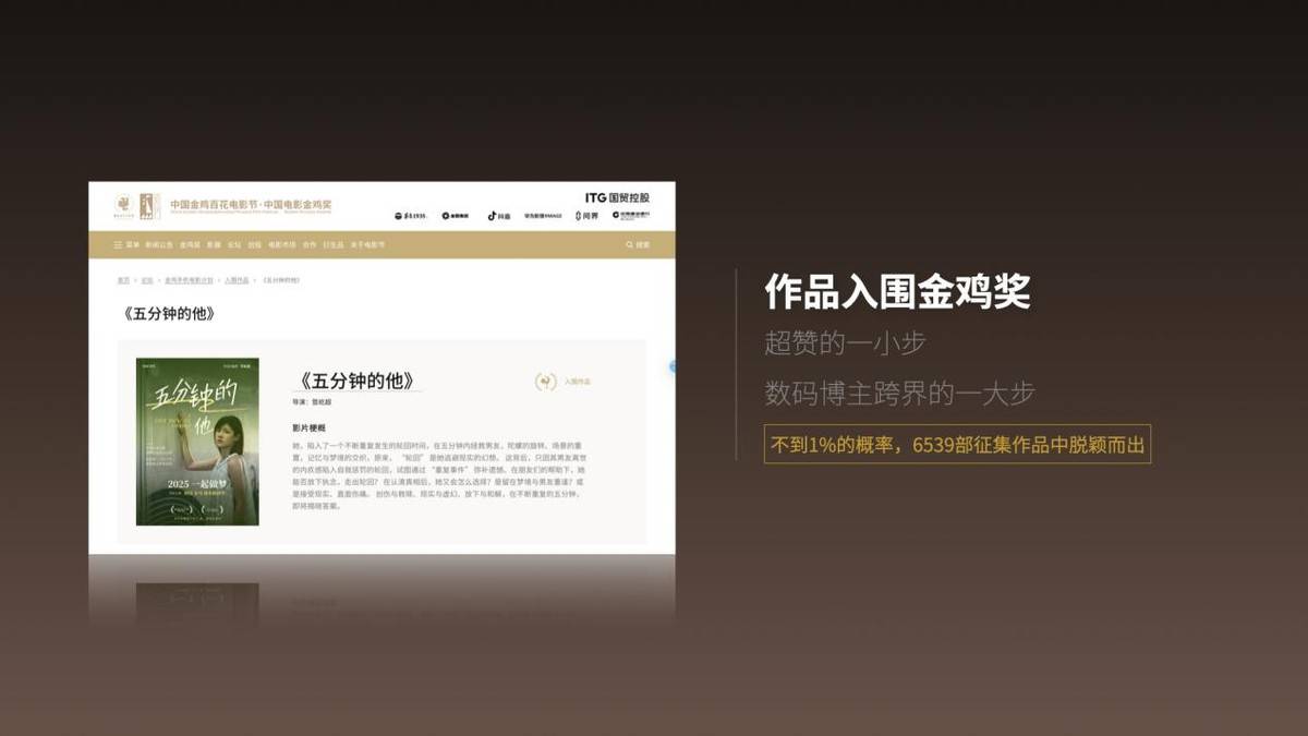他们一起,用一台4.78万的五菱之光EV,改出了全网刷屏的智能电竞车,成了参与这款车型改装的唯一数码博主,作品多次被官方邀请展览、拍宣传片; 他们一起,用一台华为手机拍出了微电影《五分钟的他》,在6539部征集作品中,以不到1%的概率脱颖而出,成功入围金鸡奖,实现了数码博主跨界的一大步; 他们一起,开着小鹏P7+闯南澳岛,复刻《飞驰人生》刹停镜头,视频拿下汽车榜Top2,仅次于何小鹏,成了客户最满意的片子; 他们一起,带着父母开启超赞之旅,7个人10天只花了36748元,不仅拍出了动人的游记,更成了整个团队最有团魂的项目。