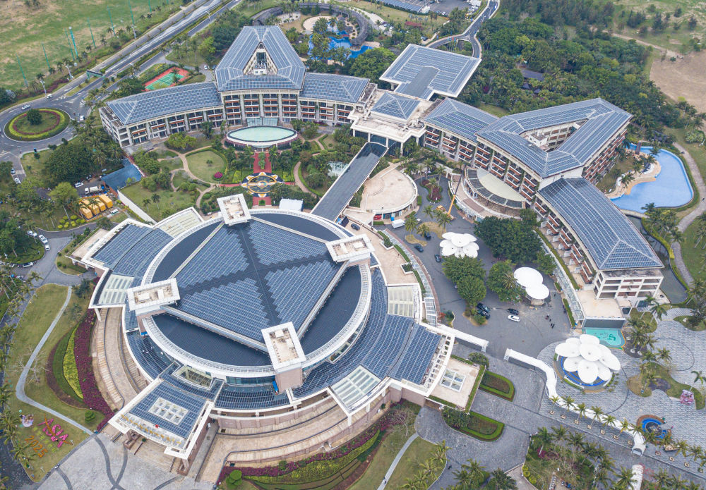 图为博鳌亚洲论坛国际会议中心和博鳌亚洲论坛大酒店屋顶的光伏设备(2025年3月16日摄,无人机照片)。 新华社记者 蒲晓旭 摄