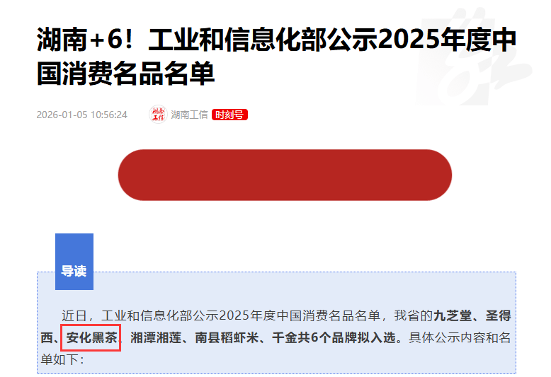 2025年,安化黑茶首次入选工业和信息化部“中国消费名品”名单,实现安化黑茶在工信部消费品牌评选中零的突破,标志着其产品品质、市场口碑与消费认可度获得国家级权威部门高度认可。